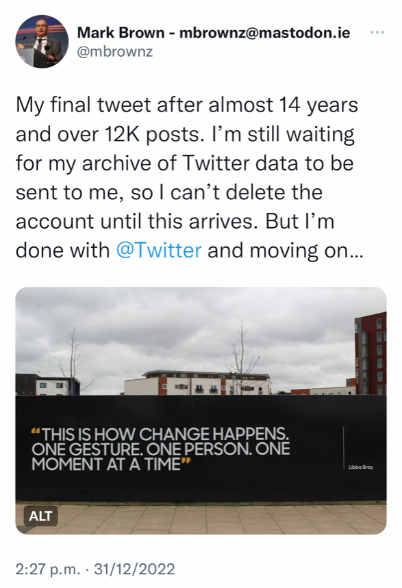 Importantly, one of the critical motivations for returning to personal blogging is that I decided to close my Twitter account at the end of 2022. For me, this was a moral decision and an important ethical stance.  It was a personal and professional response to Twitter’s new management under a single owner who appears to put profit before people and platform power before the public good and the importance of the digital commons.  You have to walk the talk of your convictions, so walking away from Twitter was simply the right thing to do, despite 14 years of active engagement, several thousand followers and over 12,000 posts on the platform.